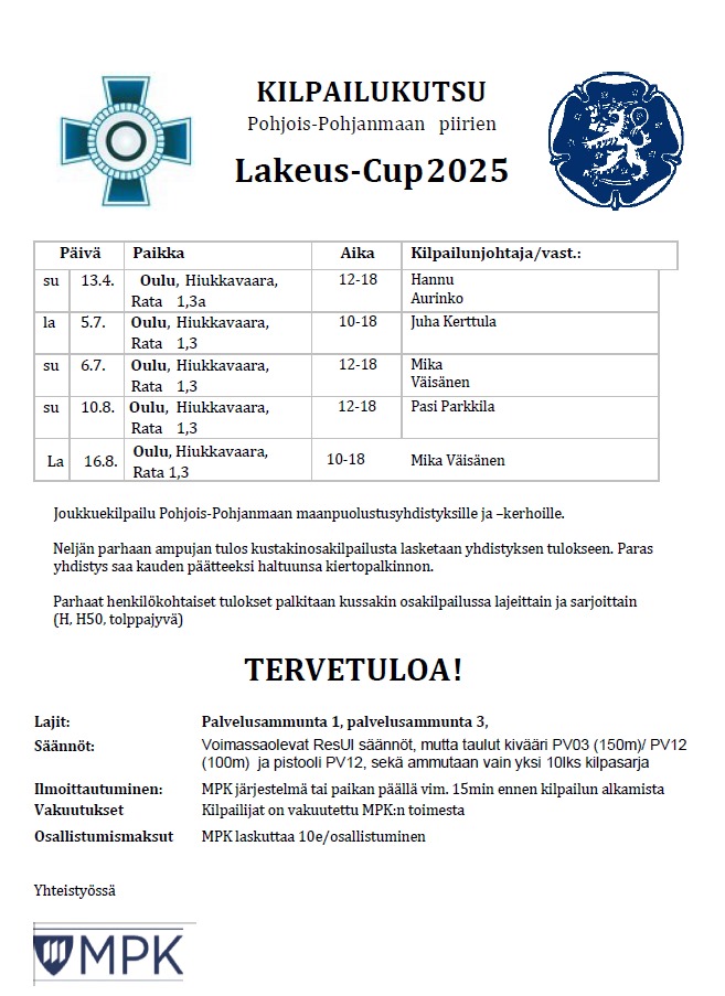 Ammuntakilpailu, Lakeus-Cup 2025 Ilmottautuminen https://koulutuskalenteri.mpk.fi/Koulutuskalenteri